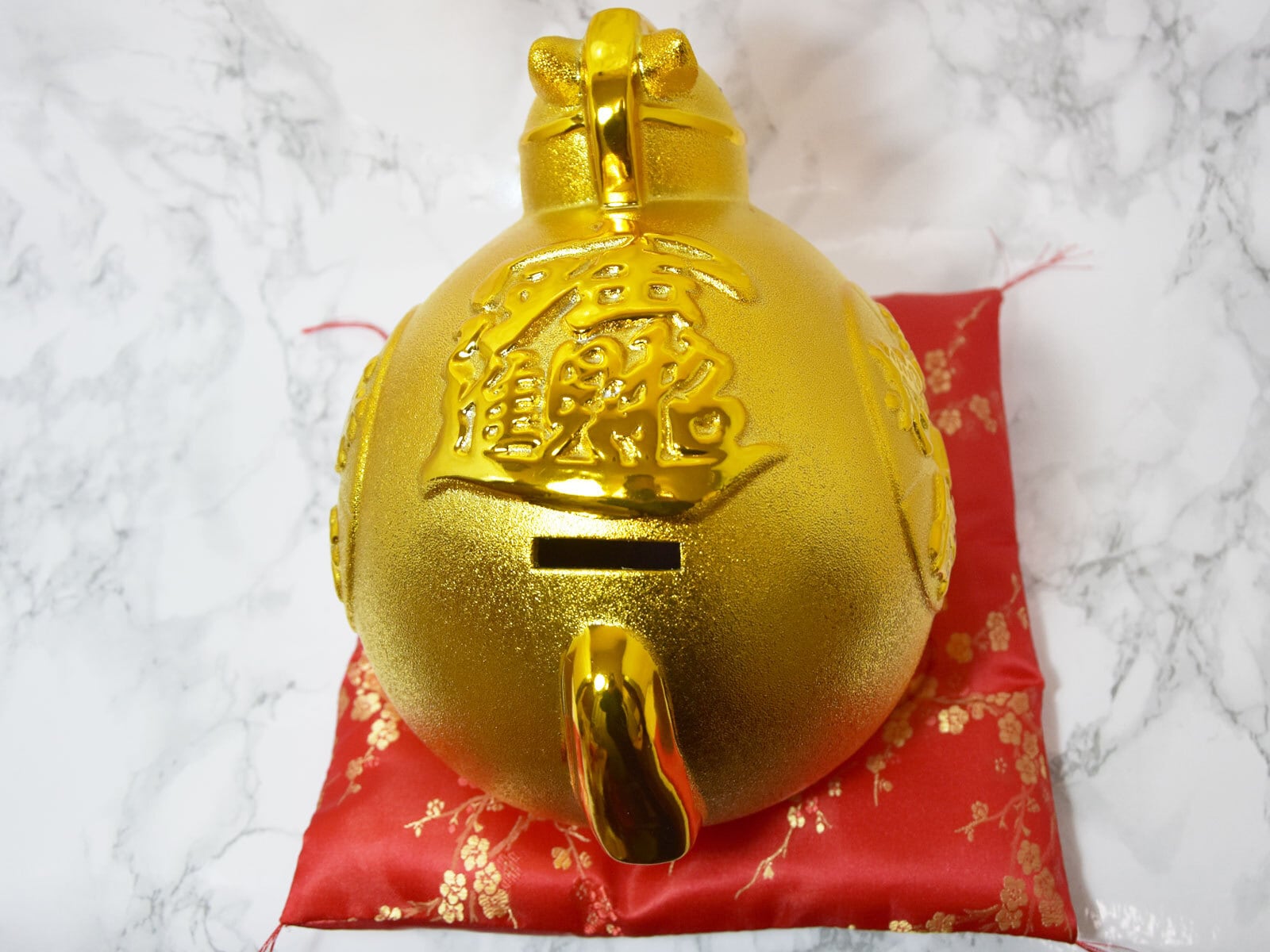 背中の文字は招財進宝、意味は「財を招き宝が入ってくる」