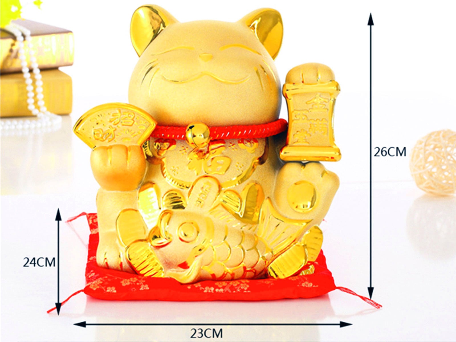 この招き猫は表面を金色に仕上げ左手に【金玉満堂】の文字。「金玉」は黄金と宝石。「満堂」は部屋の中が満たされている(お金持ちになる)を掲げて、右手には、(招財)の文字で金運を招きます。また合格祈願・大願成就・縁結び等の願いを叶えるために、お腹には鯛と小判(太鼓判=願いを確実にかなえる)がついています。金運アップに明るい色の座布団も付いてます。
