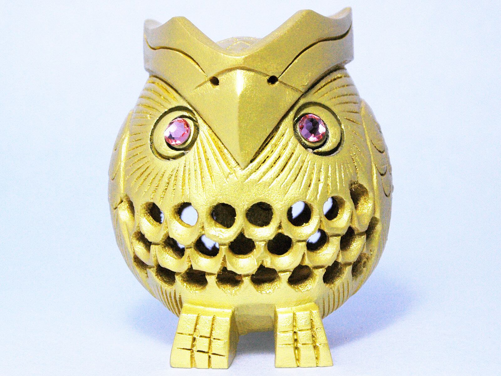 インドの伝統工芸である二重彫りと呼ばれる、一木彫で仕上げた透かし彫り技法の彫刻です。熟練職人工が網目状に彫り込み、中にもう一つのふくろうを彫る高度な職人技で仕上げられています。材質はカダムウッドというインドの神聖な天然木が使用されたスペシャルな逸品です。