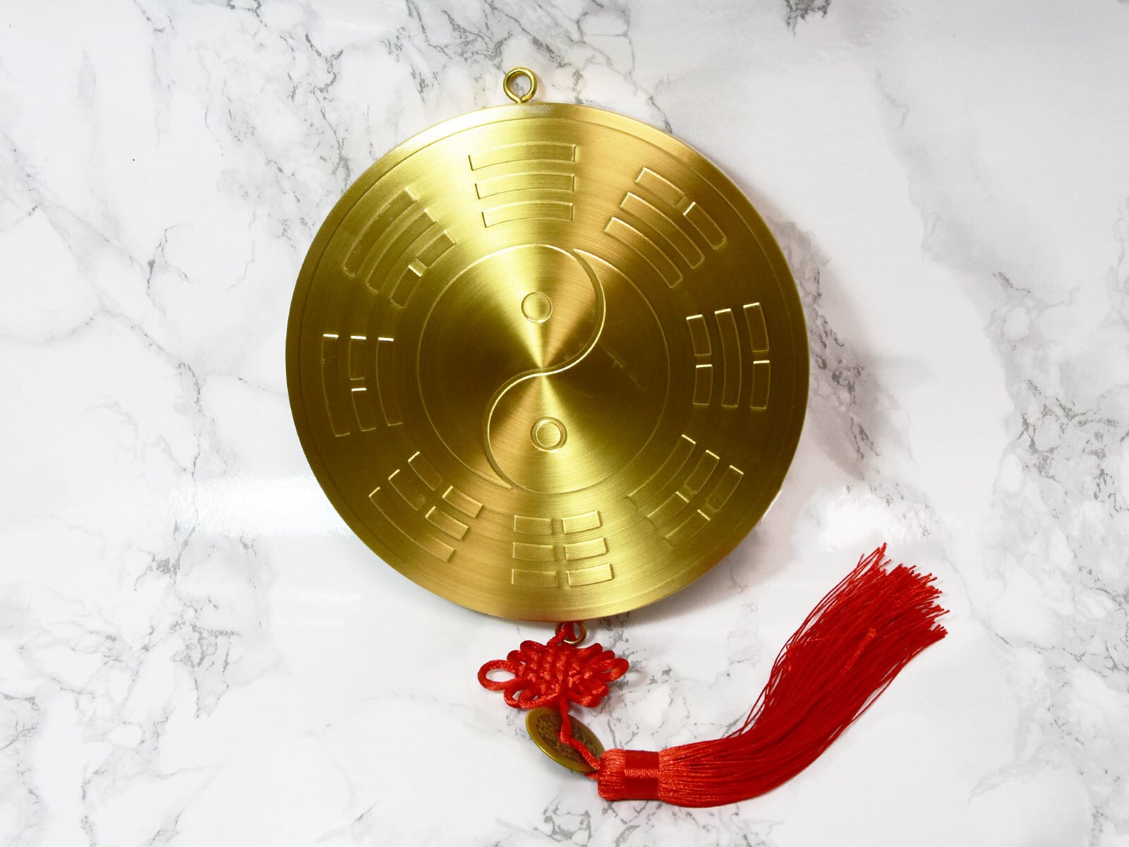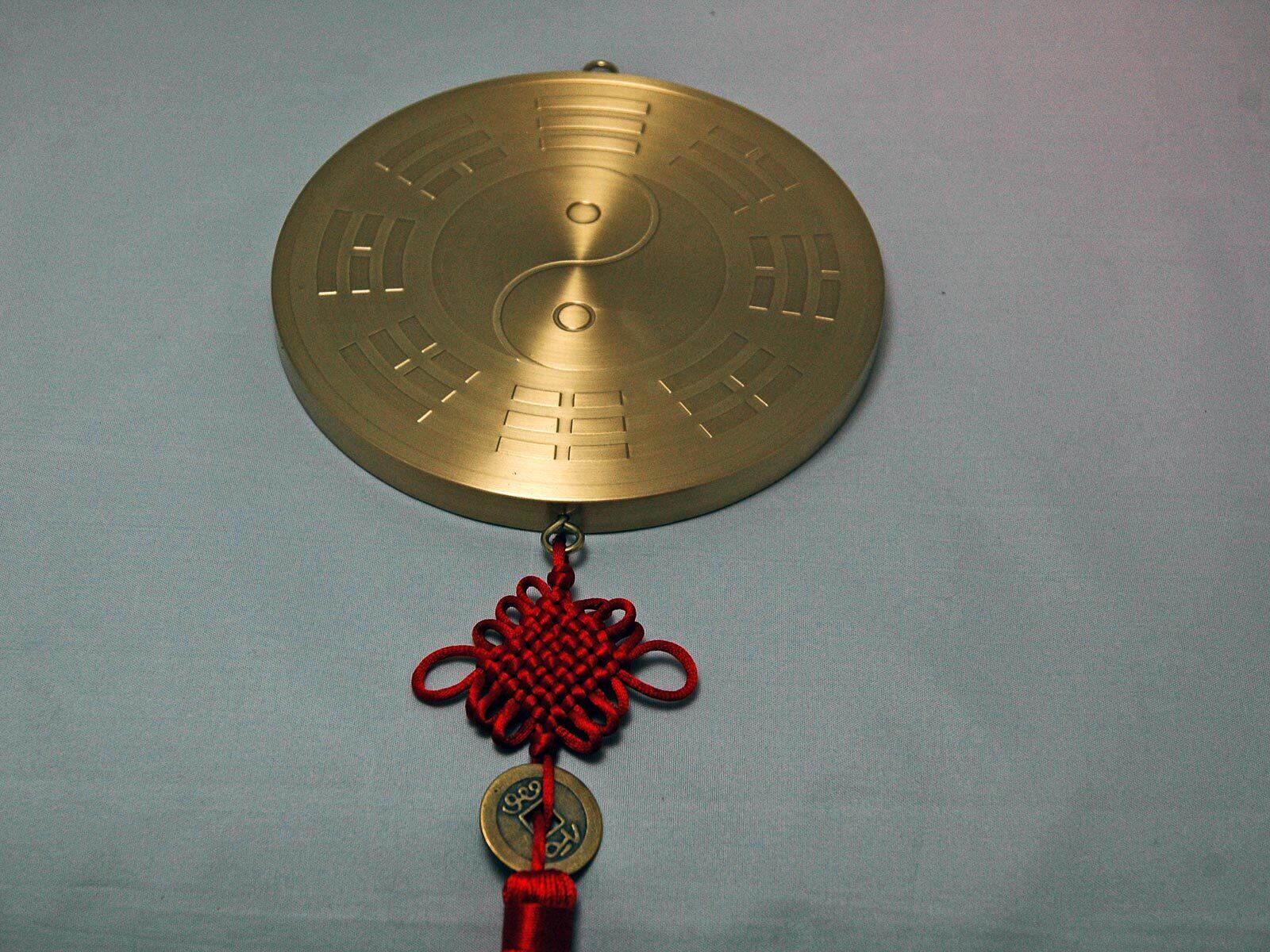本製品は、八卦凸面鏡です。裏面には【八卦太極図】を施しています。中央に宇宙万物の根源を表す「太極」を配置し、周りには全方位からの邪の気から身を護り風水上の理想的な環境を表す「八卦」を配置しています。また、下部には招財効果があると言われている風水古銭を付けています。取り付けに関しては、凶方向に人が映らないようになるべく高い位置で屋外に掛けるのがいいとされてますが、屋内の場合は、鏡面を外側へ向けて、内玄関の見えにくい場所や屋根裏、カーテンの陰などに、隠し札として掛けるのがいいといわれています。